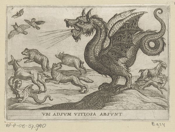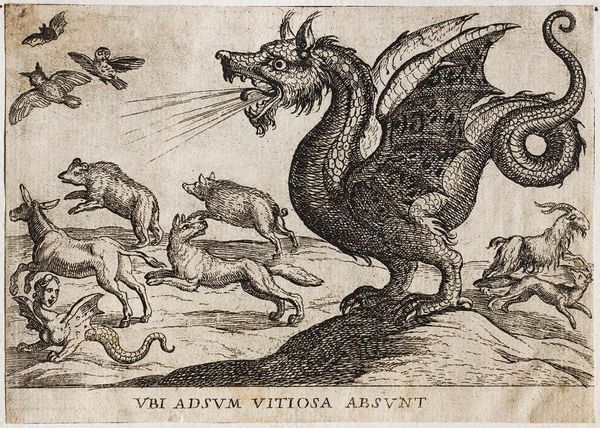 Curator: Antonio Tempesta, who lived from 1555 to 1630, created this wonderfully frantic print, titled "A Chimerical Animal Chasing other Animals", now in the Harvard Art Museums. Editor: My first thought? This dragon-like creature is having a REALLY bad day! It’s all frantic energy, scales, and fire breath. Curator: Right, that frantic energy feels very much of its time. Tempesta was working during a period of significant social and religious upheaval. I see that anxiety reflected in the relentless chase depicted here. Editor: It’s like a Renaissance fever dream. The animals are rendered so realistically, but then you have this totally fantastical beast breathing fire. It's a fascinating blend of observation and imagination. And look at the detail achieved in such a small format—just over 8 by 14 centimeters. Incredible. Curator: The political message here is what resonates with me. Tempesta used imagery to comment on the chaos of his era, using the monstrous chimera to represent the forces of discord. Editor: I think it’s a great reminder that art, even seemingly fantastical art, can be deeply rooted in the artist’s lived experience and can, at times, serve as a fun house mirror of our times. Curator: Exactly, the chimera is all of us.