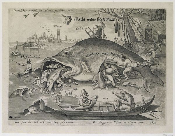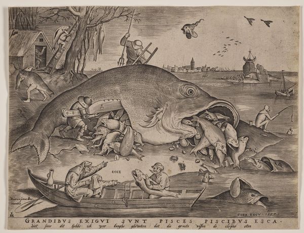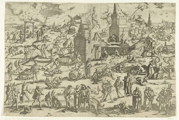 Curator: This print, titled "Geduld," which translates to "Patience," was created in 1557 by Pieter van der Heyden, after a design by Pieter Bruegel the Elder. Look closely—it's an engraving, showcasing the fine lines characteristic of the medium. Editor: It’s striking—grotesque, even. All these figures contorted into strange forms within an unsettling landscape, create an anxious energy. What’s happening here? Curator: The image teems with visual metaphors related to patience, or perhaps the lack thereof. Bruegel often used prints like this to disseminate his artistic ideas widely, turning to skilled printmakers to reproduce his intricate compositions for a larger audience. The engraving technique itself, requiring meticulous labor and precision, embodies patience. Editor: So, beyond the grueling labor involved, what are these creatures really doing? Are these the punishments that come from a lapse in patience, or... Curator: Precisely! Consider the central figure, Patience, who appears almost serene amid the chaos. The landscape behind her represents the world of suffering and temptation. To achieve "Patientia est malorum quæ aut inferuntur aut accidunt, cum aquanimitate perlatio", to ‘bear injuries and misfortunes with equanimity’, is the core principle depicted. Editor: This brings up the role of women at the time too, specifically with the idea that women are to suffer with grace, not engaging or even defending against life's injustices. The composition with the figure of "Patientia" is almost like it reinforces harmful gender expectations! How do we navigate those kinds of uncomfortable observations today, looking back? Curator: It’s important to acknowledge that the visual language of the 16th century was heavily symbolic and laden with moral instruction. The work exists within this historical framework of gender and patience discourse. But by engaging with the uncomfortable aspects, such as your astute interpretation of the woman in the foreground, we foster richer conversations about gender and society. Editor: Understanding that, and really picking through the weeds to see how it all functions is… clarifying, and admittedly, cathartic. I'm left grappling with how even something advocating for inner peace can be rooted in historical anxieties about who bears the burden of such tranquility. Curator: That’s a powerful response and a fine reminder to delve into our assumptions when confronting any artwork, especially one so enmeshed with the socio-political context of its creation.