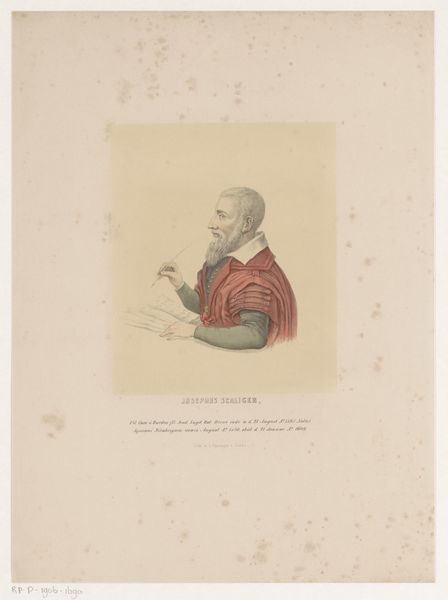 Editor: This is a print entitled "Portret van Josephus Scaliger" by Leendert (I) Springer, created around 1850. It’s an engraving and feels quite formal, very much in the style of an official portrait. What can you tell me about it? Curator: What strikes me immediately is how this portrait, though created in the 19th century, reaches back to visualize a figure from the late Renaissance, Josephus Scaliger, a scholar known for revolutionizing the concept of historical chronology. Springer is not simply depicting a man; he’s invoking a historical narrative. Who was Scaliger to this artist and his audience, do you think? Why represent him through the lens of the 19th century? Editor: I guess Scaliger represented a kind of intellectual authority to them? Someone who embodied a certain ideal of scholarship? Curator: Precisely. Academic art in the 19th century often used historical figures to legitimize its own values and hierarchies. It is using the figure of Scaliger to reinforce specific power dynamics and ideals around knowledge production that would exclude women and those considered marginal at the time. Note also the meticulous detail of the engraving - is this celebrating objective truth? Whose truth is being celebrated, and at whose expense? Editor: So, this isn't just a portrait of a scholar, it's about how knowledge and authority were constructed and visualized during a specific historical moment? Curator: Exactly! It invites us to question whose stories are told, how they're told, and who benefits from those narratives. By examining historical representation through a contemporary lens, we expose the ideological underpinnings of the work. What’s changed? What hasn’t? Editor: That’s fascinating. I see so much more than just a historical portrait now. Thanks! Curator: My pleasure. Looking at art this way gives a new appreciation of art history as a tool to explore current inequalities.