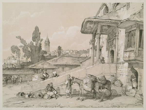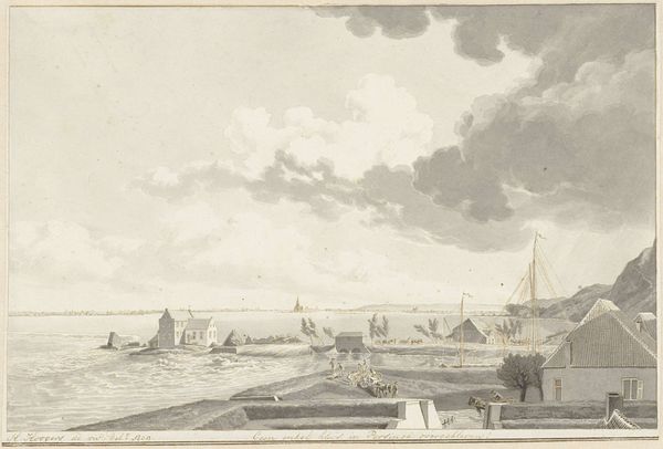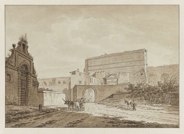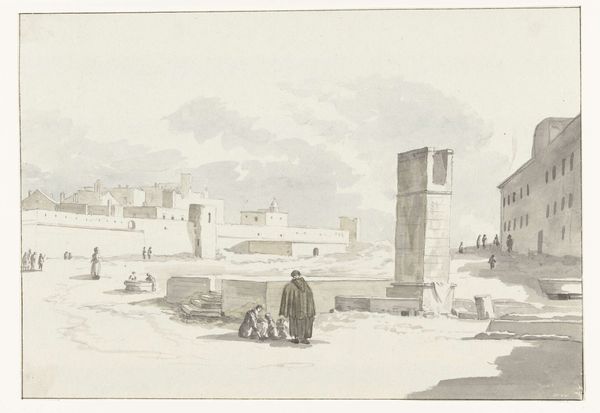Editor: This is "Gezicht op de haven van Bari aan de zuidkant" – or "View of the Port of Bari on the South Side" – a drawing in ink from 1778 by Louis Ducros, currently housed at the Rijksmuseum. It has this quiet, almost subdued energy to it, like a scene caught between moments. What do you make of it? Curator: This harbor scene is rich in symbolism, hinting at the ebb and flow of life. Notice how the boats, primary symbols of journeys and transitions, rest ashore. This suggests a pause, a moment of reflection. Even the buildings evoke history, continuity – but consider the figures scattered around the boats: what activities do you think they’re performing? Editor: I'd say it looks like they're going about the daily work of a port. Carrying materials perhaps, preparing boats… but I suppose those people, the light and architecture all speak to something beyond a simple depiction of work, right? Curator: Precisely! These elements speak of the cultural memory embedded in the port itself. Ports are places of exchange, immigration, and departure. Ducros has carefully staged them. The dome and the tower of the church are powerful reminders of stability, both sacred and secular, standing sentinel over the city. Does it resonate with anything in particular, in your personal experience? Editor: The way the people seem so small compared to the boats and the buildings makes me think of how we're all just temporary visitors, moving through spaces that will long outlast us. I’m seeing a kind of bittersweet acceptance in the face of time. Curator: Yes, and the colors enhance that sense. The subdued palette of browns, grays, and faded blues conveys a sense of nostalgia, inviting us to contemplate the passage of time. The image whispers of both permanence and impermanence – of lives lived, stories told, and the relentless march of history. Editor: I hadn’t considered how strongly the colors were contributing. I'm leaving this conversation with a completely different point of view of the image. Thanks! Curator: And thank you! This layering of symbolism makes experiencing art such a multi-faceted process, every visit brings with it a new dimension and new questions.