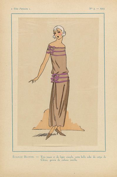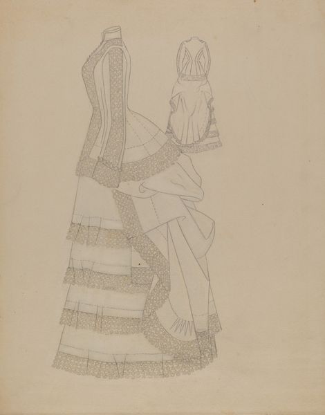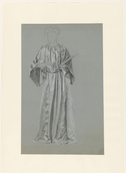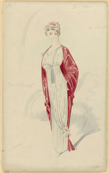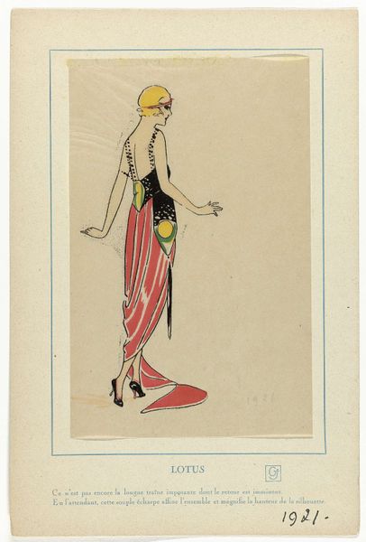 Editor: Okay, here we have Otto Lendecke’s 1912 print, "Fashion (Mode)." It feels…ethereal, almost like a figure from a dream. What strikes you about this work? Curator: The Art Nouveau style is readily apparent, but let’s delve into the visual language it employs. What’s the first thing that jumps out at you in terms of symbolism? Editor: I suppose the figure's pose, the way she holds that...fruit? An orb? And that stylized headdress! Curator: Precisely. That object, likely an apple, is rich with meaning, often representing knowledge, temptation, or even vanity depending on its context. And how does her gesture impact your perception of the woman, given this symbol? Editor: She seems almost fragile, hesitant. Not like a brazen Eve figure, but more contemplative? Like she's presenting the idea, rather than the action. Curator: The averted gaze reinforces that impression. There’s a deliberate ambiguity – is this figure empowered or constrained by her 'mode'? Lendecke invites us to question the very nature of fashion and its influence, doesn’t he? It’s a loaded symbolism that transcends mere trendiness. Editor: I hadn’t considered the conflicting nature of fashion as a concept like that! Thank you. Curator: A pleasure. These works allow us to decode the symbols we've internalized, and perhaps question them.