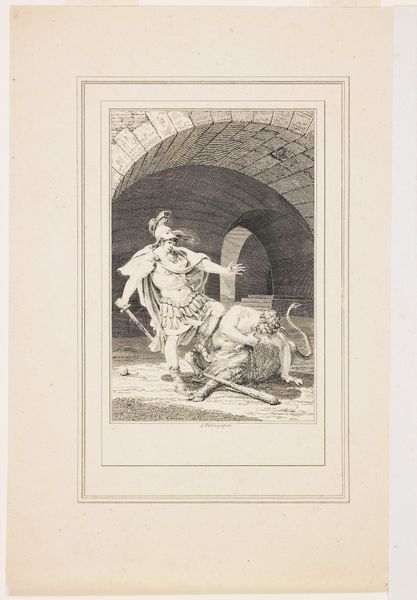 Curator: This is a fascinating engraving, “Vignette from the Metamorphosis of Ovid,” dating back to the 18th century and attributed to Jacques-Louis Petit. It depicts a scene brimming with dramatic tension. Editor: My initial reaction? There’s such a stark contrast between the polished rendering of the triumphant figure and the agonized twisting form of his defeated opponent, set within the oppressive architecture. Curator: Indeed. The socio-political climate of 18th-century France heavily influenced Neoclassical art, drawing inspiration from antiquity and its emphasis on heroic virtue and rational order. Works like these would have resonated with ideas circulating about citizenship, power, and even morality. Editor: Yes, you can feel the influence. The artist uses strong, controlled lines to define the muscularity of the figures and create a palpable sense of weight and solidity, a classical ideal, which I find somewhat softened by the dramatic diagonals. And what’s your read on the use of light here? Curator: Light certainly serves a vital role, theatrical almost! We have stark light on the victor and then deep shadows across his victim. This, I suspect, invites the viewer to take sides in a narrative imbued with contemporary societal ideals of dominance. It suggests a moral position. Editor: True, but visually the light is so much more than propaganda. It highlights not just power, but also, oddly, vulnerability in the victor's stance. He’s exposed and yet triumphant; I am uncertain of him. Does this moral aspect also speak to the politics of imagery in Parisian printmaking circles at the time? Curator: Absolutely. Engravings and prints played a critical role in disseminating ideas and images amongst a broader audience, allowing these historical and mythological subjects to reinforce existing social hierarchies or even to subtly challenge them. This also raises the artist, Petit, who would have benefited from commissions of such art. Editor: It's fascinating how this small etching can offer such insight into both the artistry and the social forces at play in the 18th century. I see now how this detailed line work builds toward something more significant, more charged than merely a scene from Ovid. Curator: Precisely. Studying how artworks circulated then—and how they shape narratives even now—gives context and allows for new connections and insights. Editor: A testament to how formal analysis, linked to larger questions, always brings so much richer meaning to visual artworks.