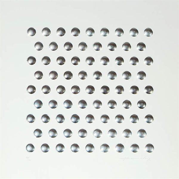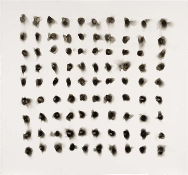 Herman de Vries created this untitled piece in 2013 using ink on paper. Your eyes are immediately drawn to the simple yet rhythmic arrangement of dark marks against the stark white background. The repetitive nature of these forms evokes a meditative, almost hypnotic state. De Vries' work often explores the relationship between humanity and nature through the lens of minimalism and conceptual art. The grid-like structure, which might at first appear rigid, reveals subtle variations upon closer inspection, challenging our perception of uniformity. Each mark, unique in its shape and density, can be seen as a sign. A sign not just existing on the surface but representing a microcosm of the natural world's infinite diversity and the artist’s structuralist approach to organizing organic forms within a systematic framework. Consider how the interplay between order and randomness destabilizes our expectations, prompting us to question fixed meanings and embrace the inherent variability of existence.