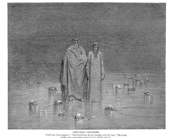Gustave Doré made this engraving, "Traitors--Bocca Degli Abati", in the 19th century. It illustrates a scene from Dante's Inferno, where Dante and Virgil encounter the traitor Bocca in the frozen lake of Cocytus, the ninth circle of Hell. The image creates meaning through its stark contrasts and dramatic composition, evoking the torment and despair of the damned. The setting is hell, but we might also recognize the political turmoil of 19th-century Europe in this image. Dore was working during a time of massive social upheaval. The old feudal order was collapsing but new more democratic structures were emerging. Loyalty and betrayal are central themes. To fully understand Doré's work, we can consult literary sources like Dante's Inferno, historical accounts of the period, and critical analyses of Doré's artistic style and social context. The meaning of the artwork becomes clearer when we see it as deeply rooted in its specific social and institutional context.