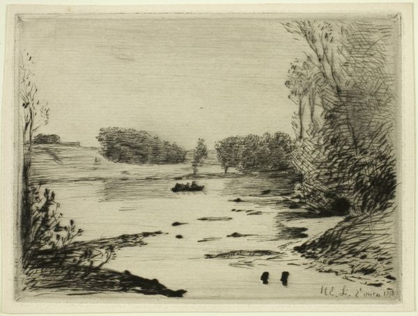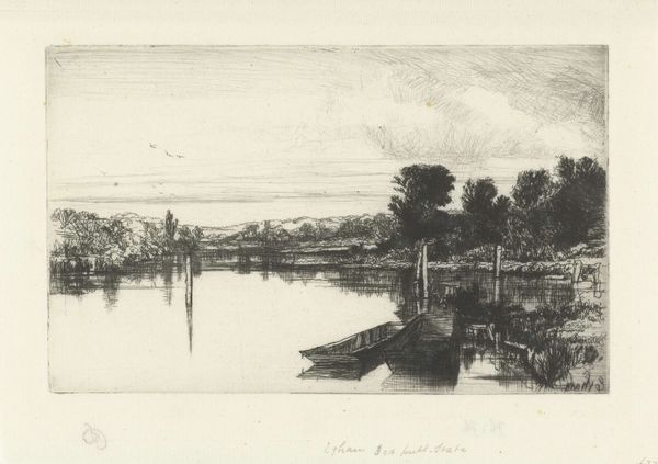 Editor: This is "Speyside," an etching by David Young Cameron, from 1888. The scene feels quiet, almost dreamlike, and I am intrigued by the boat in the middle distance; it appears to be nearly subsumed by its environment. What connections do you draw from this artwork? Curator: It is so easy to become ensnared in nostalgia when looking at a piece like this. It speaks to the complex relationship between the Scottish landscape, identity, and the industrial revolution that was then transforming labor practices. Think about it: the etching presents this ostensibly untouched vista. Yet, by the late 19th century, the Highlands had been subject to enormous social change due to land clearances that displaced tenant farmers from their ancestral lands to create large estates for sheep farming or deer hunting. In a world marked by progress and urbanization, did artworks like these evoke not just natural beauty, but an idyllic past irrevocably slipping away for those displaced and disenfranchised? Editor: That's fascinating. It completely reframes how I see that little boat; it is now not simply present but possibly emblematic of human movement and social change. Is the choice of the etching medium significant? Curator: Absolutely. Etching lends itself to detailed line work, mimicking the detail present in nature itself, while the tonal variations allow for expressive atmosphere. Moreover, prints circulate easily and therefore render images widely accessible. Consider who comprised the audience of prints at this time, and what that implied for the relationship between those individuals and ideas concerning both access to, and control of, natural resources. To whom do scenes of 'Speyside' truly belong, then? Does that differ from who might have actually seen and interacted with this print at the time? Editor: Thank you. It's like you’ve revealed a whole new dimension. It is more than just a pretty picture. Curator: Precisely. Art encourages critical engagement, asking us to explore not just what is depicted but the web of power and perspective surrounding its creation and reception.