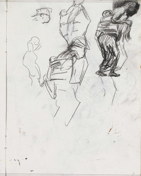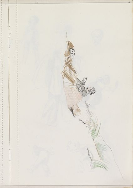 Curator: Munch’s “Kvinnelig modellstudie,” a female nude study from around 1920, rendered in pencil and watercolor on paper. What catches your eye about this piece? Editor: The raw vulnerability of it. It’s a study, sure, but there's also a tangible exposure of both the subject and the artistic process itself, those washes of color feel very revealing. Curator: Exactly. It’s expressionistic, definitely – typical Munch in that sense. It departs from strict representation, embracing emotional expression above all else. The subject’s pose, arms raised above her head, is common but here it has this slight air of unease about it. Editor: That pose...it simultaneously feels like a celebration of the body, a reaching for something, but also a sort of yielding, right? I'm wondering about the politics of displaying the female form, especially in this era when ideas about female liberation were emerging alongside ongoing objectification. Was Munch self-aware in his treatment of his models, or was he perpetuating the same male gaze we see everywhere else? Curator: It's always a complicated question, the male gaze and art. He clearly sees beauty, yes, but perhaps there is a sadness there too. The looseness of the watercolor seems to imply the emotional turbulence roiling just below the surface. Editor: Absolutely. Those watery pigments, they don’t just depict; they almost *weep*. Thinking about how Munch wrestled with anxieties around sexuality and the feminine… how much of that seeps into our reading of this female form? Is this woman seen, or simply *felt* through Munch's own inner landscape? Curator: Possibly both? He struggled intensely with relationships, seeing women often as both madonna and temptress. So, you may be right to ask what parts vulnerability and idealization have here. Editor: It certainly invites contemplation, forcing us to confront our own preconceived notions about the body, gender, and the complex relationship between artist and model. Curator: It does. The sketchiness becomes an invitation—allowing us, demanding of us, to see more than what's literally presented. Thank you, that's an angle I had missed before.