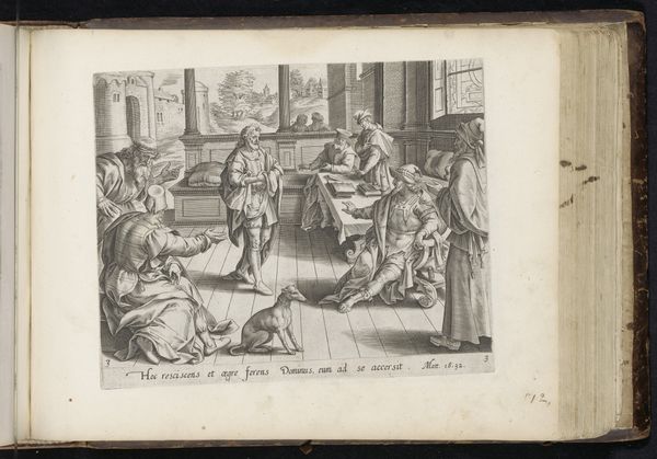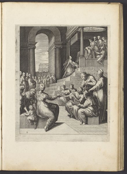 Editor: This print, "Christ Heals a Possessed Woman," by Philips Galle, likely created between 1575 and 1646, is incredibly detailed. The figures are all so expressive! What do you see in this piece? Curator: I'm drawn to the stark visual contrasts. See how the compressed figures of the tormentors loom menacingly over the suffering woman? Then, look at Christ extending his hand to heal; this simple gesture conveys boundless compassion and a divine power. Note that Christ never physically touches those he heals in Galle's renditions of scripture. This signifies not only social standing, but the woman's cursed body has, essentially, been tainted. The people surrounding the scene become a narrative. Their presence represents societal and theological weight to a very humanistic moment. How does that play into your first impressions? Editor: It emphasizes the moment's drama. The contrast makes Christ's compassion appear even more striking because everyone is reacting so dramatically. Are those seated figures judging or skeptical? Curator: The onlookers create an unsettling tension. This recalls other symbols and stories that share similar structures: the leper ostracized from his community who finds grace, a narrative strategy to address outcasts and alienation in larger theological contexts. Think about how artists use that dynamic to reveal enduring social tensions in our own time. What common symbolism have you encountered elsewhere? Editor: Thinking about social tensions differently has completely changed my perspective. The seated figures represent so much more than just judging skeptics now. Curator: It's about layering those visual symbols; these are echoes through art history!