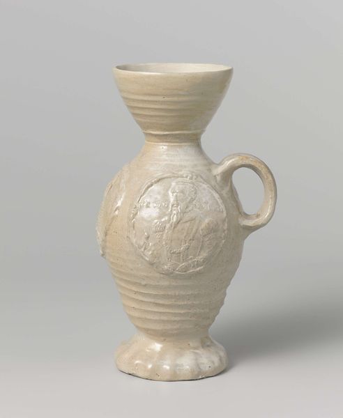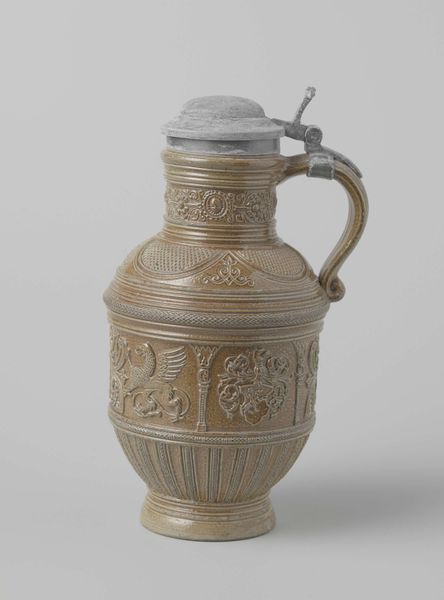 Curator: What strikes me immediately is this jug’s slightly stern but refined aura. The cobalt blue against the stoneware gives it an almost regal feel. Editor: Indeed. The “Jug with a representation of the electors” crafted around 1602-1620 is a remarkable example of ceramic work, reflecting the political landscape of the Holy Roman Empire at the time. The piece is attributed to Jan Baldems Mennicken. Curator: Ah yes, the electors. You can see them represented in those arched panels that encircle the middle section, right? What power these symbols must have held. To see these figures—even symbolically—adorning something as quotidian as a jug, well, it’s fascinating. Editor: Precisely! These weren’t merely decorative choices. The imagery around this jug speaks to power, legacy and also regional identity, intended to impress on anyone drinking. It shows the importance of civic virtue made useful and functional. Curator: Do you find that pieces like this offer a view into the anxieties of the period? It's as if the artist is not simply depicting power but perhaps grappling with its permanence, encoding meaning that now, centuries later, prompts new reflection. Editor: It certainly opens questions, prompting dialogue on statecraft of its time. The strategic distribution and function of stoneware during this time frame would signal the role this object plays. A piece like this jug signifies not just utility but also complex layers of symbolism. The ceramic artwork serves to educate as much as hydrate, in a public discourse made permanent through form. Curator: Thank you, my friend. Now, with this information I have renewed admiration of its ability to communicate historical dynamics within material. Editor: Yes. It exemplifies the capacity of everyday objects to embody potent socio-political ideas—a vivid intersection of history, utility, and art.