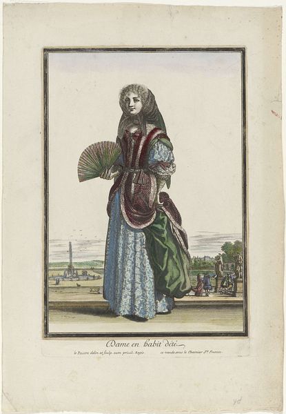 Editor: This drawing from the 1820s, "Costumes parisiens: les ouvri\u00e8res de Paris," is credited to Gatine and Lanté. It shows a Parisian working woman rendered in colored pencil. There’s a formality to it, almost a sense of stillness. What leaps out at you when you look at this piece? Curator: It makes me think about how much fashion – then and now – can obscure the realities of working women. It's so stylized; even the workbox seems almost ornamental. Doesn't it strike you as a strange disconnect between the title’s promise and the presentation itself? Editor: Absolutely. It's called “working women,” but it almost feels like the focus is more on her presentation, the ideal. There isn’t an emphasis on her work, really, just that box. Curator: Exactly. The "genre-painting" aspect seems more about type than the individual, reduced to costume. Perhaps what's really interesting is this tension: that delicate balance between presentation, idealization, and reality. I wonder, could it be that this "stillness" hints at something beyond mere fashion? Is there a quiet strength in this depiction, despite its artifice? Editor: That’s a great point; now that I think about it, there's also strength in how neatly kept and presentable she appears even at her station, which also defies any sense of destitution. Curator: Indeed! Seeing beyond the immediate surface like that always unlocks new avenues of contemplation. Maybe it's not just about documenting work; it is a projection of aspirational values. Editor: That’s fascinating. Thanks so much; I hadn’t thought about it that way! I learned that it’s crucial to look beyond the initial aesthetic to really see and feel what an artwork is expressing. Curator: Agreed! These historical portraits offer an interesting mirror—to both then and now!