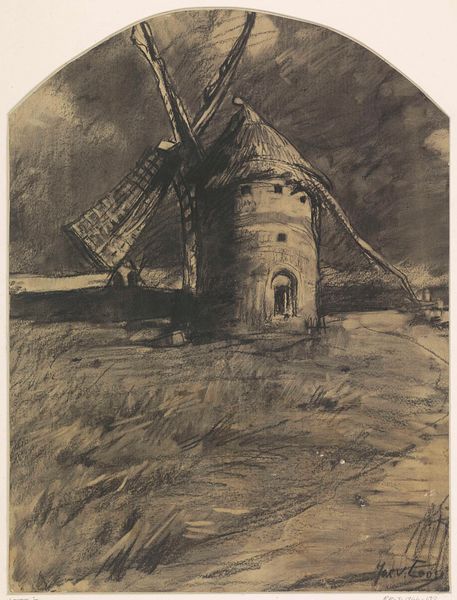 Curator: Looking at this pencil drawing by Jakob Nussbaum, I immediately feel a sense of quiet observation. The architectural forms, rendered with soft gradations, hint at a lived history. Editor: Nussbaum’s "Farmstead in Nagybánya," dating back to September 14, 1896, it captures something elemental. What strikes me first is how incredibly grounded it feels despite the somewhat undefined skyline. Curator: Yes, there's a grounding quality that’s interesting when thinking about the symbols rooted within these settings, particularly agricultural ones. The building has a fortress-like, almost church-like dome structure which speaks volumes, even beyond its rural purpose. Editor: I agree, there's almost an intentional obscurity at play, softened edges. Given that it comes from a period marked by considerable social and political transition within Austria-Hungary, one must ask if that sense of uncertainty speaks to an era's psychology. Curator: Exactly, those anxieties manifest, in part, I think, within the iconography we choose, what we build, what we monumentalize, and the very act of meticulously drawing the everyday can speak to anxieties surrounding permanence. This tower-like building certainly feels monumental even as a farm building. It seems that its function alone may not fully encompass what it means. Editor: It does stand tall amidst a landscape reduced to planes. In comparison, the wooden structure at the front almost reads as transient or temporary—a stark material and structural contrast to the seemingly eternal construction right behind it. Curator: This may be just what he wanted to emphasize here by means of simple composition. By using different textures the image guides your eyes towards those emotional dichotomies of old versus new or safe versus ephemeral. The singular cypress on the right frames the architecture vertically in this way. Editor: Ultimately, the scene and this moment are fixed in time and preserved through Nussbaum’s skilled, understated rendering. Thank you for untangling the personal and period complexities, Curator. Curator: And thank you for bringing it back to history; that’s the lens by which our modern eyes see it today, whether we wish it or not.