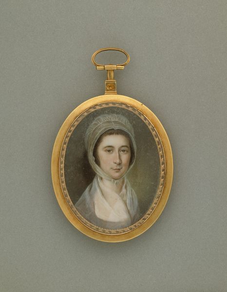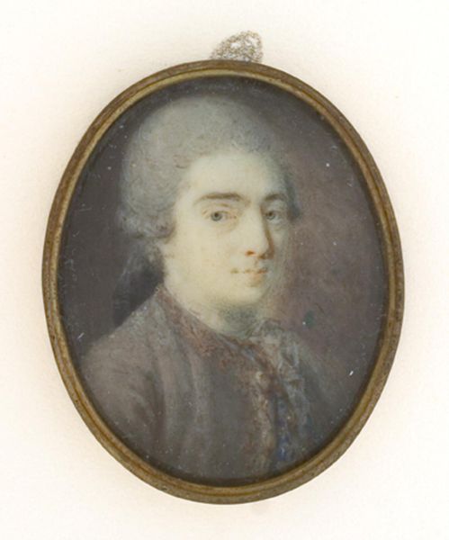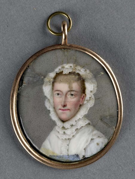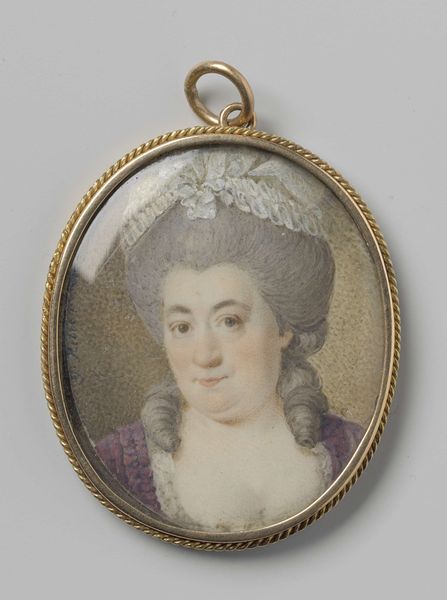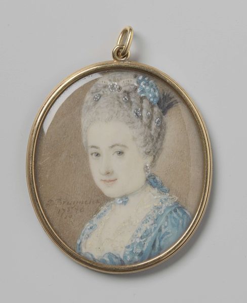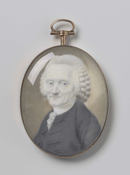 Daniël Bruyninx's miniature portrait presents a man with powdered hair, set against a muted brown backdrop and encased in a gold frame. The tight composition focuses attention on the man's face, rendered with delicate brushstrokes and subtle color variations that capture the soft texture of his skin. Consider how Bruyninx uses the oval format to frame the man's face, drawing the eye along smooth curves. The gold trim accentuates the portrait's preciousness, signifying the sitter's status and wealth within the era's semiotic codes. The meticulous detail and miniature scale invoke a sense of intimacy. The slight smile plays with our perception; is it a genuine expression or a performance of social grace? This ambiguity invites us to destabilize fixed interpretations and consider the complexities of identity representation in portraiture. Ultimately, this miniature is not merely a likeness, but a carefully constructed image intended to convey specific social and personal meanings.
