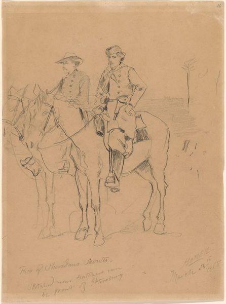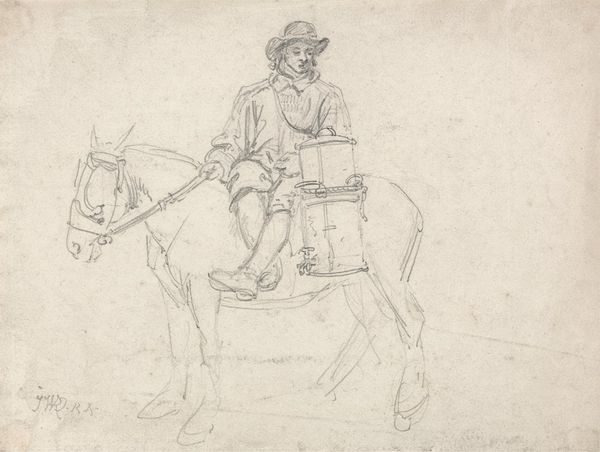 Curator: Ah, yes. We're now looking at "Boy Sitting Side-Saddle on a Donkey" a pencil drawing created sometime between 1810 and 1873 by Wilhelm Marstrand. It's a deceptively simple sketch, isn’t it? Editor: Deceptively is right. My first thought was, oh, that’s sweet, but then the sheer quietude of it hit me. It's as if the entire world is holding its breath. Is the donkey about to move or what is that awkward pose the boy sits on him about? I have so many questions! Curator: Indeed. Side-saddle suggests a certain informality, maybe even a touch of mischief. Traditionally, side-saddle riding was common for women as riding astride was seen as improper. The symbolism in this context perhaps subverts traditional expectations, associating this young boy with a gentler form of authority or leisure. He almost looks like he's not sure about something or even feels hesitant! Editor: Or he just doesn't know the rules yet! I like your take on it. It’s fascinating how even in a seemingly simple sketch, the placement of the figure evokes something so poignant, so much like waiting, suspended. Also, look at how that boy seems like a perfect weight distribution for that donkey who would agree to be side-ridden on by that cute figure! Curator: Notice the relatively sparse linework. Marstrand isn't trying to present us with photorealistic detail. The scene relies more on suggestion and emotion. The slightly tilted hat, the downturned gaze... these contribute to a palpable sense of thoughtfulness, or perhaps even weariness. Editor: Weariness makes so much sense! I feel like there is almost an underlying symbolism relating the boy’s uncertain positioning on the animal to childhood's clumsy journey to mastery or understanding. Curator: Precisely! The donkey itself is an age-old symbol, laden with diverse meanings, depending on the culture—humility, stubbornness, but also perseverance. Editor: True. It is that whole burden-bearing creature across so many folklores, so in its own, the donkey stands in quiet opposition to the small boy that is on top of it. One feels its ancient duty as the other embodies the uncertainties that one grows out of with time! A poignant intersection. Curator: Well said. This seemingly simple sketch hides a depth of meaning—about youth, about expectation, about the quiet journeys we all take. Editor: Absolutely. It invites you to wander, wonder, and linger in the delicate details of existence, or, like this boy on a donkey, just try to keep your balance for now.