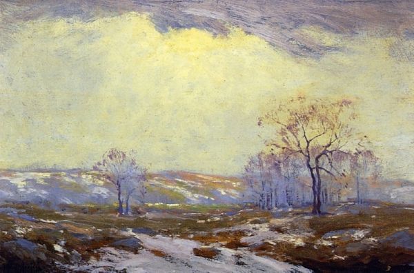 Pierre-Jacques Pelletier made this painting, Paysage Enneigé, using oil on canvas. Pelletier captured a seemingly ordinary winter landscape, but the application of the oil paint imbues the scene with a palpable sense of atmosphere. Consider the texture: thick, deliberate strokes define the snow-laden trees and the path, creating a layered surface that captures the weight and density of the snow. Notice how the artist uses the materiality of the paint to convey the specific, sensory qualities of this place and time. The grey sky is full of clouds, applied with looser brushwork that contrasts the solid trees and evokes the feeling of a cold day. Pelletier’s application of paint is more than descriptive; it’s expressive. The artist engages with the labor of image making as well as the social context of rural life. It is the physical process and skilled manipulation of his materials that truly bring this work to life.