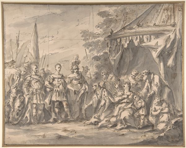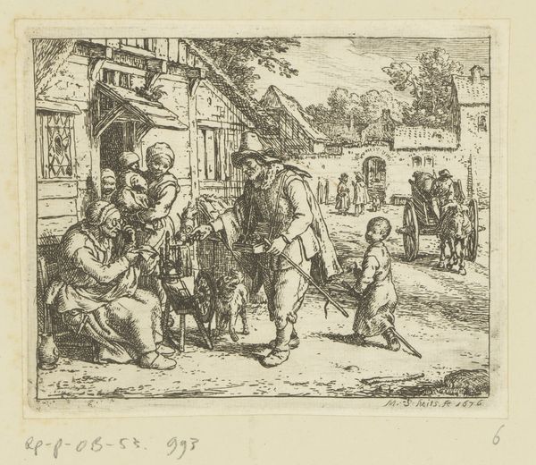 Curator: This ink drawing, dating from 1693, is entitled "An Itinerant Peddler in a Village," and it's the work of Cornelis Dusart. The composition, while dynamic, gives me an impression of organized chaos. The monochromatic rendering makes it slightly unsettling; everything appears flattened. Editor: Yes, there's a frenetic energy here, isn't there? So much clamor and merriment erupting all at once. Notice how Dusart utilizes the figure of the peddler not just as a central element, but almost as a cultural lightning rod around which village life seems to pulse and swirl. Curator: I see the structure functioning on multiple levels. On the one hand, we have the detailed rendering of forms suggesting an almost baroque fullness, particularly in the peddler’s immediate surroundings, contrasted with the thinner application further in the background, emphasizing spatial recession, giving this composition depth despite the two-dimensional flatness. Editor: Indeed. Think of the peddler and his wares--a fascinating blend of the sacred and the profane. I see what seems to be a statuette or effigy hoisted aloft, while the other objects could range from domestic tools to toys. It represents commerce but is tied into something deeper: the human desire for the talismanic object, a physical symbol of hope, fortune, or identity. It ties deeply into their cultural belief systems. Curator: That's astute. The convergence of detail versus the more diffuse applications further into the scene also creates a symbolic contrast between individual action and collective experience. This reminds the viewer that we must look beyond the action taking place with the figures in the center to view the town. Editor: Also note the dog, running ahead and unburdened; such creatures have long served as symbols of guidance. Notice, also, the somewhat jeering faces emerging from the architecture-- perhaps suspicion about newcomers. The narrative teems with human character types, all caught up in this everyday theater of survival and commerce. Curator: Yes, but beyond mere storytelling, it’s in the skillful articulation of volume through limited tonal variation. It exemplifies that in Dutch Golden Age art even common narratives can hold great artistic refinement, particularly within a deliberately chosen compositional structure. Editor: Absolutely. It is one thing to note its composition, and another to reflect on this art's value as a cultural repository of a community's fears and desires. An exquisite time capsule if ever I saw one.