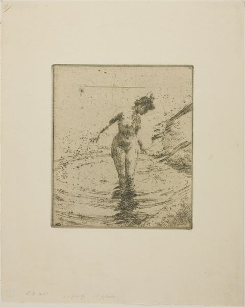 Editor: This is "Wet," an etching by Anders Zorn from 1911. It’s incredibly detailed, given the medium – you can almost feel the water. What's your take on this? Curator: For me, the power of "Wet" lies in its meticulous etching technique. Consider the labor involved: the precise cuts into the metal plate, the repetitive dipping in acid, the skilled printing process. How does this deliberate act of making, this *production*, influence our interpretation of the nude figure and the bathing scene? Editor: It does lend it a sense of... industry, almost. Like something manufactured rather than purely inspired. Curator: Exactly! And that friction is crucial. Zorn wasn't just depicting a sensual scene; he was engaging with the *means* by which such scenes were disseminated and consumed. The print medium itself invites a discussion about access, ownership, and the market. Was Zorn subverting high art expectations, engaging in commerce, or both? Editor: That’s interesting. I hadn’t considered how the method influenced the meaning so directly. The etching almost democratizes the image. Curator: It makes you think about who is viewing this and where? And further, how does the "wetness" signified in the image connect to the literal wetness of the etching process itself? This connection emphasizes the physicality of art production. Editor: So, not just about the subject, but the whole journey, from the artist's hand to, say, a collector’s wall. Curator: Precisely! By acknowledging the labour and materiality, we move beyond simply appreciating beauty, we engage with the very conditions of art's existence within a specific historical context. Editor: I see this piece so differently now. Thinking about the material production has definitely deepened my understanding. Thanks! Curator: My pleasure! It’s vital to always consider how art is produced as much as what it depicts.