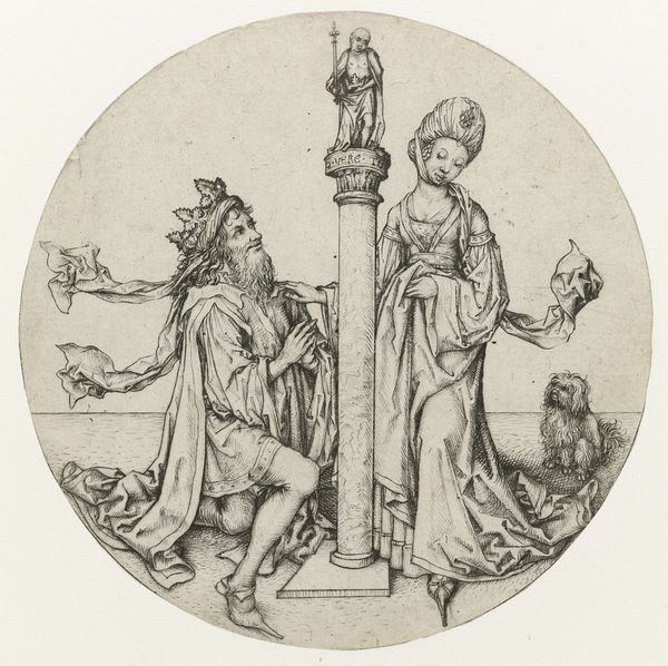 Sebald Beham created this roundel of Saint Christopher and Erasmus using pen and brown ink, with watercolor washes. The composition divides the circular space into two distinct yet interconnected zones. On one side, Saint Erasmus is rendered with a formal rigidity, his posture erect. His presence is balanced by Saint Christopher on the other side, a figure depicted mid-stride, carrying the Christ Child. Beneath each saint, a heraldic shield is placed, adding layers of meaning beyond the purely religious. The restricted palette of browns, greens, and grays gives the piece an understated, almost melancholic mood. The work is not merely a religious depiction; it is an exercise in symbolism and structure, inviting us to consider how the arrangement of figures, colors, and heraldic devices come together to communicate power, faith, and identity. How do these forms create a dialogue around the cultural values and power dynamics of Beham’s time?