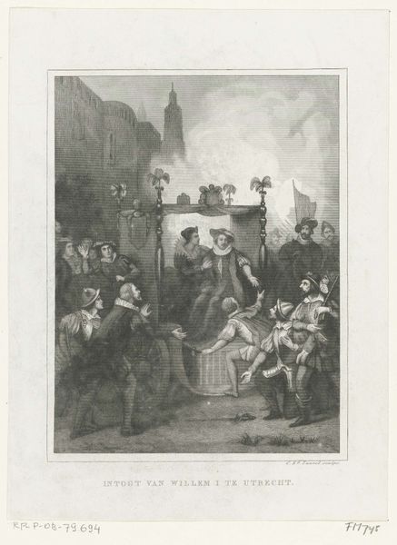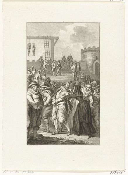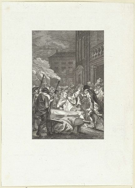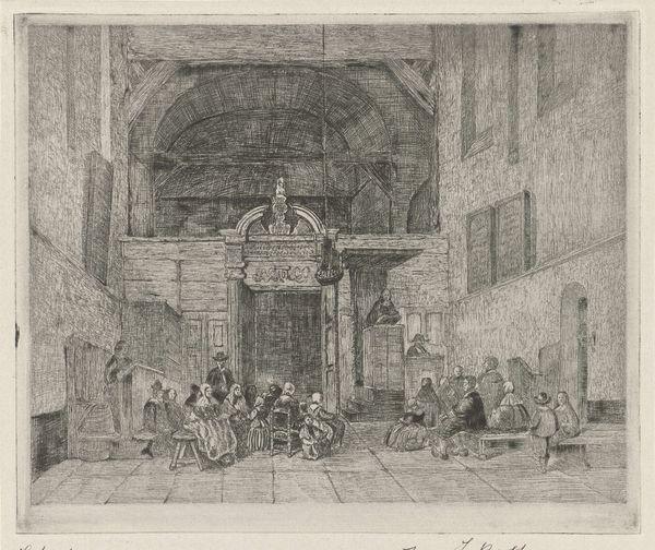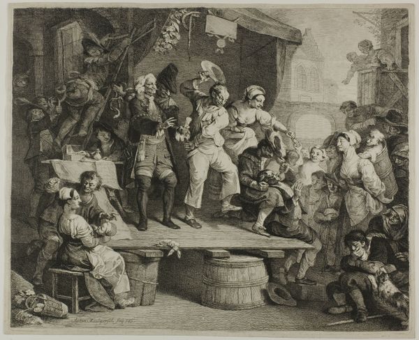 Editor: So this etching, "Dance in the Inn" by Adriaen van Ostade, made sometime between 1650 and 1654, really feels like a slice of daily life. It’s incredibly detailed for a print. What do you see in this depiction of Dutch Golden Age revelry, focusing on the everyday materials and conditions of the working class? Curator: Well, let’s start with the 'means of production', so to speak. Ostade has chosen etching. An intaglio process involving considerable physical labor. Why that process, to represent this subject? Think about what this choice signifies when contrasted with the subject matter: celebrating labor through representing the labor involved to produce this print. Editor: That's interesting, it’s sort of a double labor... and that level of detail. It is unexpected in an inn setting. The clothes hanging up, the ramshackle building. He doesn't romanticize things. Curator: Exactly! He shows the material reality of their lives. The image celebrates, but also exposes, the inherent material realities of a society where revelry is directly born of that labor, even 'produced' through those material conditions. It questions the traditional divide between "high" art, which would depict noble scenes or landscapes, and this so-called "low" subject. Where is art placed socially? Who dictates these labels, "high" and "low", through consumption? Editor: So he's showing the direct connection between their work and their leisure through this kind of…meta-process. Seeing labor and leisure coexisting that way… I never really thought about the materiality of social class. Curator: Precisely! This etching makes us consider the lives of these figures not as isolated moments of pleasure but also related to the materials of their clothes, houses, and the art. Editor: Okay, I’m starting to think about these historical techniques like weaving and construction beyond art history! Curator: That's great! Now, let’s think how consumer demand for 'genre scenes' impacted artistic creation and shaped our views about 17th century Netherlands' people.