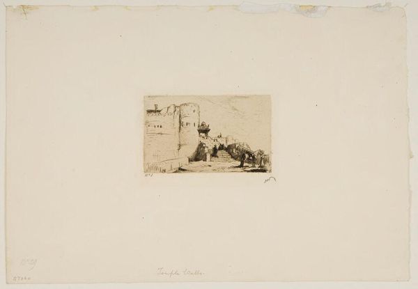 Editor: This is Arthur Evershed's "On the Banks of the Thames". It's an etching, and it feels very serene. What do you see in this piece? Curator: The Thames, over time, has symbolized both pastoral calm and bustling industry. Notice the flag. Does it evoke a sense of national pride, perhaps a yearning for simpler times before industrialization irrevocably altered the landscape? Editor: I hadn't considered that. The flag does give it a specific context. Curator: Exactly. How does the wheel’s stillness speak to you? Is it a relic of a bygone era, or a subtle reminder of the ceaseless flow of time and change? Editor: I see both, actually. It's like the past meeting the present. I've certainly learned a new way to look at it. Curator: And I'm reminded how potent simple scenes can be, carrying complex emotional and historical weight.