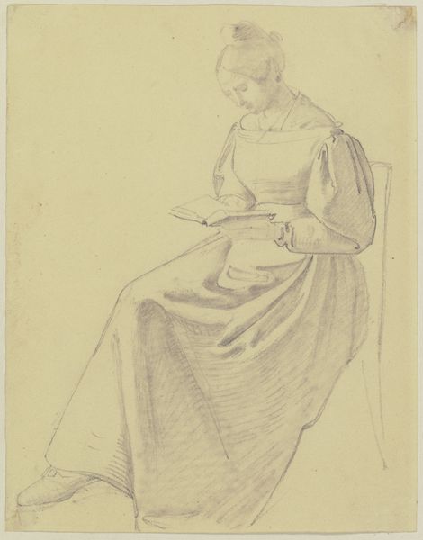 Otto Scholderer created this drawing of a serving girl, likely in the mid-19th century, using graphite on paper. The drawing’s impact lies in its simplicity. Scholderer’s quick, light lines capture the sitter's form and the texture of her garments. Note how he uses varying pressure to suggest depth and shadow. The inherent qualities of graphite—its smoothness and ability to create a range of tones—allow for subtle nuances in the depiction of light and shadow, lending the figure a sense of volume. Consider the social context: depictions of working-class individuals became increasingly popular as subjects for art during this period. Scholderer’s choice of subject reflects an interest in the everyday, a shift away from purely aristocratic portraiture. By focusing on the process and the materials used, we can appreciate how Scholderer imbued this seemingly simple sketch with both artistic skill and social commentary, bridging the gap between fine art and the realities of daily life.