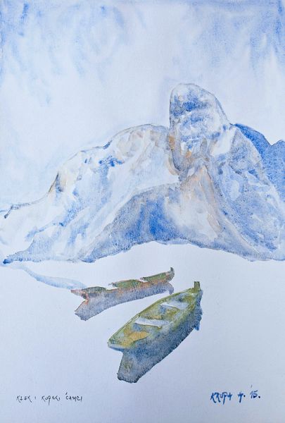 Sattar Bahlulzade created this painting, Goy-gol, with an approach that feels like a delicate dance between representation and pure abstraction. The way he handles the watercolor suggests a real love for the medium. Look at how the washes of color blend and bleed into each other, especially in the rendering of the titular Goy-gol lake. It's thin, almost transparent in places, building up a luminous, watery surface. Then, on the hillside, see how these tiny spots of vibrant color, reds, yellows, and greens, form a mosaic, almost like the landscape is made of tiny jewels. There’s a sense of the physical world being dissolved into light and color. It reminds me of Turner, but with a more intimate, almost childlike touch. It celebrates the sheer joy of applying paint to canvas, embracing the process of art-making as a journey rather than a destination. It's a conversation between the visible world and the boundless possibilities of paint.