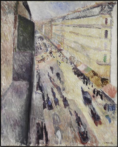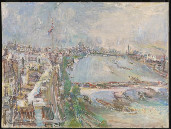 Curator: Kossoff’s "Demolition of the Old House, Dalston Junction, Summer 1974" presents an urban landscape in the process of erasure. There's a palpable sense of transience. Editor: The churn of material! I see the sheer weight of application, the thick impasto reflecting the labor of destruction and renewal. It’s like witnessing the physical act of tearing down and rebuilding. Curator: Yes, and the image of demolition carries a potent symbolic weight, especially given Kossoff’s personal history marked by displacement. The diagonals, the fracturing, they all speak of disruption. Editor: But also, consider the materials themselves, the oil paint slathered on, almost like plaster or concrete. Kossoff isn’t just representing a scene; he’s enacting a process with his own hands, collapsing the distinction between art and craft, high and low. Curator: I agree, that Kossoff seems to be trying to find permanence in the ephemeral nature of demolition, turning rubble into an enduring image. Editor: This piece leaves me pondering the constant flux of the urban environment and the often unseen labor underpinning its transformation.