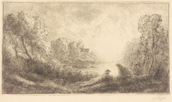 Editor: This is "Landscape: Near Chailleux," an etching by Alphonse Legros. It feels almost…hushed. Like a secret whispered by the woods. What catches your eye when you look at this? Curator: Oh, that hush is spot on! Legros was masterful at capturing mood. For me, it's the way he suggests depth using such delicate lines. See how the foreground is denser, with more hatching, creating this sort of shadowy invitation into the lighter, more ethereal background? It reminds me of half-remembered walks in the woods. Do you ever get that sense, a flicker of a past experience resurfacing? Editor: I do, actually! The way the trees kind of fade into the background, like a memory. But I'm curious – what do you make of that bare tree on the right? It looks so stark compared to the others. Curator: Ah, the rebel of the forest! Perhaps it symbolizes resilience, standing stark against the backdrop. Or maybe it's simply Legros being honest – nature isn’t always perfectly picturesque. Sometimes the imperfections speak the loudest. Did Legros do a lot of landscapes? Editor: Not that I’m aware. I know him more for his figure drawings, portraits and religious scenes. So perhaps this etching offers another layer to understanding him as an artist. Curator: Precisely! It reveals the breadth of his sensitivity, doesn’t it? Reminds us not to box artists, or ourselves, into neat little categories. I suppose art is just what happens in the in-between. Editor: I'm definitely going to look at Legros’ work differently now. Thanks!