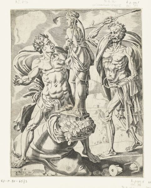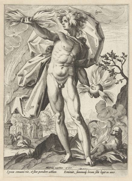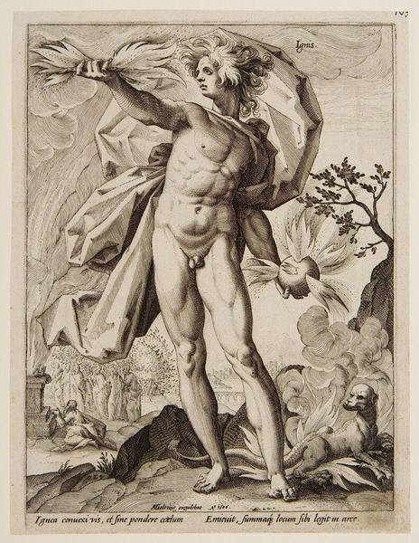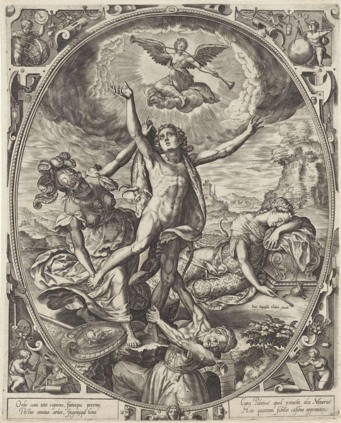 Johann Sadeler I created this engraving, Triomferende Christus, in the late 16th century, a period defined by religious conflict and reformation across Europe. Sadeler’s triumphant Christ stands over a skull and serpent, symbols of death and temptation, while holding a banner of victory, surrounded by adoring angels. The image blends religious conviction with prevailing societal norms. Christ's masculine and idealized form mirrors the period's valorization of the male body, indicative of the era's gendered power dynamics. The engraving would have served to reinforce the power of the church. However, this image also offers an opportunity to consider individual spiritual experiences. In a time of upheaval, it offers a message of hope, portraying salvation and triumph over earthly struggles, a sentiment that remains potent and relevant today.