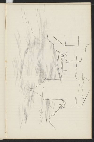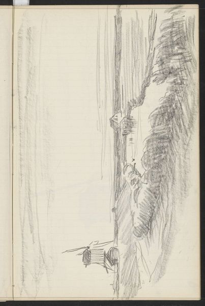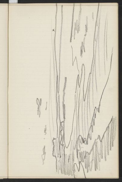 This is a river landscape drawing by Willem Bastiaan Tholen, made using graphite on paper. What strikes me most about this piece is its immediacy; it feels like a thought caught in motion, a fleeting impression recorded directly from life. Look closely, and you'll see the texture of the paper showing through the delicate strokes of graphite. The artist hasn’t tried to conceal the process, but embraces it, letting the lines dance and weave across the surface. Notice how the marks coalesce to form trees, water, and sky, yet retain their independence as individual gestures. The right-hand side of the image is dominated by a series of vertical strokes that suggest a looming treeline. The contrast between the dark, heavy strokes of the trees and the lighter, almost ethereal quality of the sky creates a sense of depth and atmosphere. Tholen reminds me of Whistler, or perhaps even some of the early Impressionists, in his willingness to embrace ambiguity and suggestion. It's like he's saying, "Here's what I saw, but what do you see?"