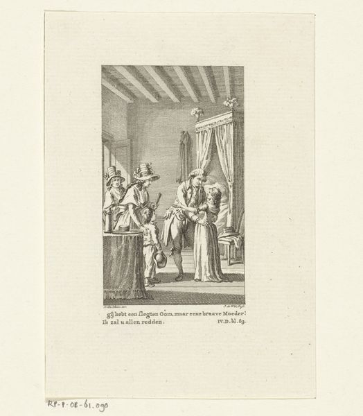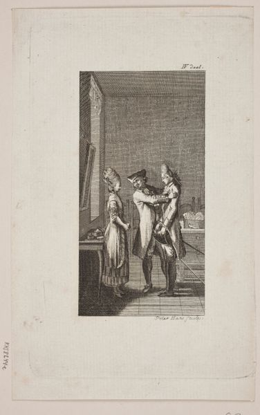 Editor: This is "Illustration med kone der standser en herre ved en port mens en tjener ser til," created around 1801 by Meno Haas. It's a print, an engraving really. There's something so intriguing in the simplicity of the lines, yet the scene feels so charged. What strikes you about this piece? Curator: Immediately, the etching technique pulls me in. The labor involved in producing the plate, each line carefully incised, speaks volumes. How was Haas's access to materials and printmaking technology? These are vital to consider. Moreover, look at how this print, a multiple, makes this scene accessible to a wider audience than, say, an oil painting could. Editor: That's fascinating! I hadn't considered the wider accessibility of printmaking at the time. Does that impact how we understand the subject matter too? Curator: Precisely. The very *materiality* of this print connects to its potential audience and, I suspect, a growing middle class. Consider the context: a woman stopping a gentleman at a door. It suggests social dynamics around wealth and gender, which, disseminated widely via prints, could fuel discussion and shape public opinion. It is about representation as a material process. What kind of paper did he use, what press did he utilize, and who distributed the final piece? All point toward what was consumed, and how! Editor: So, by focusing on the process and the materials, we can gain insight into the artist's intentions but also the social impact this image may have had? Curator: Exactly! We need to view art-making, consumption, and cultural moments together to understand what art achieves! Editor: Wow, looking at the piece now, it feels much more dynamic. Thinking about how it was made and shared really adds depth. Curator: It does. It’s about interrogating how materials are produced and distributed within a given context. That allows us to go further in the understanding of how such art impacted the moment of its production, distribution and use!