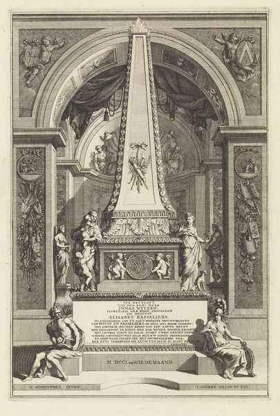 This is Jan Goeree’s "Monument for the Marriage of Jonas Witsen and Elisabet Basseliers," made around 1700 using pen, brush, and gray ink. The monument dominates, rising vertically with layers of ornamentation and figures in a symmetrical arrangement. This symmetry is framed by an arched structure, where the draped fabric adds to the sense of formality. The use of monochrome enhances the classical, almost sculptural feel, emphasizing form and shadow. This drawing is not just a depiction but a symbolic construction. The careful placement of figures and decorative elements suggests a deeper narrative about marriage, status, and cultural values. The use of classical motifs within a structured, symmetrical design reflects the period's interest in order and representation. Notice how the drawing functions as a cultural artifact, where artistic and social elements intertwine to convey meaning. The monument, with its visual cues, serves as a site of ongoing interpretation and re-interpretation, reflecting the values and ideals of its time.