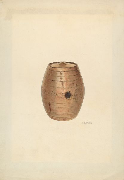 Editor: Charlotte Angus's "Bee Basket and Cover," made around 1938, is so delicately rendered in watercolor and drawing. There's something humble, almost reverent, about the way she depicts this utilitarian object. What strikes you most about this image? Curator: The basket, particularly when paired with bees, acts as a potent symbol. Think about the interconnectedness the bee signifies: community, industriousness, sweetness. Do you notice the basket’s form itself? It’s almost womb-like, evoking notions of protection and sustenance, linking to ancient symbols of the vessel as a sacred feminine form. Editor: I do see the connection to nurturing now that you point it out. Curator: Now, consider this image in the context of 1938. Were these baskets disappearing, perhaps being replaced by manufactured containers? Editor: I hadn’t thought about the timing. Perhaps the artwork becomes an act of preservation, recording a dying tradition? Curator: Precisely! The image then moves beyond mere representation. It takes on the added symbolic weight of cultural memory, a yearning for a perhaps simpler time, using a humble bee basket as its central emblem. Can you see now how the ordinary is often deeply entwined with the extraordinary? Editor: I definitely see that, especially how seemingly simple objects carry significant weight. Thanks, that’s a new perspective. Curator: My pleasure. It always amazes me how seemingly mundane objects and the visual language we use to represent them connect us to cultural continuity.