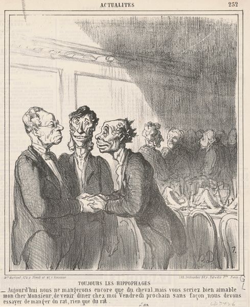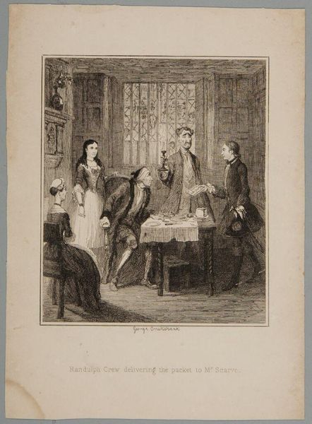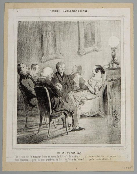 Curator: "Lecteur du moniteur," or "Reader of the Monitor," is the title of this lithograph crafted by Honoré Daumier in the mid-19th century. A scene of bourgeois leisure unfolds before us. What's your immediate take? Editor: There's an unsettling stillness. It feels like a tableau vivant, more staged than sincere, despite the supposedly intimate domestic setting. All eyes are directed—ostensibly—at the reader, but I wonder, what's truly being consumed here? Curator: Look closely at Daumier’s technique. Notice the strategic hatching that builds volume and the clever deployment of light and shadow. See how he directs our focus through stark contrast, especially around the reader's face and the postures of each figure, which, when taken together, compose a narrative—one could see these choices alone and deduce some narrative regarding their characters and relationships with each other. Editor: And it's a narrative steeped in the socio-political realities of 19th-century France. The title points us directly to "Le Moniteur Universel," the official government newspaper. Who had the time and resources for such leisure and what messages are those with privilege interested in spreading? I wonder who has control of the story both in and out of the picture's frame. It isn’t an accident to think about the figures that populate it. Is she actually sharing her husband's discourse or is she strategically shaping public perception in her home? Curator: A fair assessment. Note how Daumier complicates the classical portrait format—not just visually but conceptually—while his contemporary Eugène Delacroix uses similarly intimate portraits to advance romantic ideas about individualism, Daumier focuses on the performance of social roles. His artistic practice often involved critiquing or poking fun at the norms of the establishment. Editor: Exactly. Are we meant to see this as a benign domestic scene or a calculated performance? The almost voyeuristic quality, the static poses… it’s all designed to unsettle and make us question what power dynamics are at work. It even looks a bit haunting. It all hints at a subtext beneath the surface, something perhaps sinister lurking within these polite interactions. Curator: An interesting perspective to keep in mind! Overall, the work strikes a balance between formal execution and social commentary. It's hard to dismiss how the visual organization alone gives shape to our interpretation, Editor: It serves as a potent reminder that even seemingly private moments can be politically charged sites of negotiation, resistance, or reaffirmation, that remain worthy of continued interrogation.