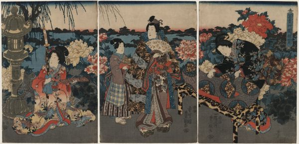 This triptych woodblock print, created by Utagawa Kunisada, presents us with a vivid tableau of autumnal leisure. The dominant motif of the full moon, known as "Meigetsu", bathes the scene in a soft glow, symbolizing reflection, and the passage of time. Observe the presence of lanterns, not merely for illumination, but as carriers of symbolic light, reminiscent of ancient torch processions, guiding us through metaphorical darkness. These are not mere decorative elements; they echo the psychological need for guidance. Consider the ladies in their domestic setting, adorned with kimono patterned with maple leaves, suggesting a connection with seasonal changes. These images evoke the ancient Dionysian revels, where the changing seasons were celebrated. Think of the emotional weight carried in these cyclical symbols, each autumn a return, a remembrance, engaging us on a deep, subconscious level. This is not merely a snapshot of a season, but a resurgence of symbols, each echoing across time, evolving, and reforming.
