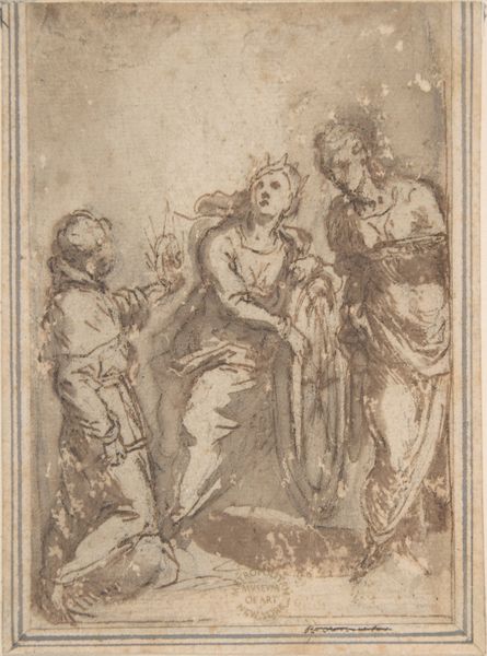 Curator: This captivating drawing, entitled "Allegory of Sculpture," was created in 1619 by Johann Andreas Rauch and is currently held in the collection of the Metropolitan Museum of Art. Editor: It’s striking! There’s an almost dreamlike quality, a gentle and ethereal mood evoked by the monochrome palette and the flowing lines. It’s a tableau suspended between worlds, isn't it? Curator: Indeed. The artist employs line and tone to construct a symbolic world. Note the central figure, a woman, presumably representing Sculpture herself, cradling a child. Editor: The woman, positioned centrally, reinforces the established art historical rhetoric. She is holding the child who may signify artistic creation as birth. How does the art work reinforce or subvert common allegorical tropes? Curator: Observe, also, the collection of instruments surrounding her feet – drafting tools, a globe, an architectural rendering. They are placed purposefully to symbolize knowledge. The arrangement underscores the intellectual and skilled labor inherent in sculpture. The materiality suggests graphite or charcoal drawings. Editor: Yes, but looking at the cultural context we should acknowledge this symbolic positioning and skill are rooted in a male dominated practice, so who had access and opportunity, and how can we expand the narrative and acknowledge the contributions of women sculptors of this time, or women in Rauch's community and life who facilitated his practice? Curator: A crucial point, certainly. Perhaps we can see Rauch's use of the female form as an acknowledgement of both the practice, and a lament for its imbalance? It certainly promotes considerations on craft. Editor: In terms of contemporary culture and audience reception I'm always trying to reconcile the art history canon. How might we read the woman differently? The female personification and symbolic meanings serve a larger narrative, and might act as a means to introduce contemporary theory that can extend conversations and create change. Curator: An important observation, how these elements can be re-read in various contexts to deepen our interpretation. This reading encourages a fresh perspective on Rauch's piece, challenging classical interpretations and revealing additional layers of meaning embedded within the artwork. Editor: It highlights the dynamism and constant negotiation in understanding artistic achievement.