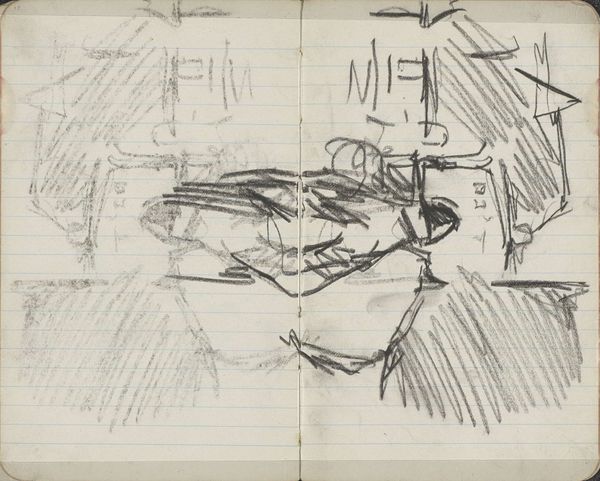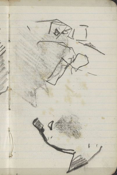 Curator: Looking at George Hendrik Breitner’s "Twee figuren", dating from around 1890 to 1900, I immediately think about how quickly the figures are drawn. Editor: It feels raw and unfinished, doesn't it? Almost voyeuristic, like a snatched glimpse of everyday life, perhaps from a bustling cafe scene or the like. The stark contrast of heavy pencil against lined paper only intensifies that feeling. Curator: Breitner’s style definitely leaned into that fleeting moment; an aesthetic that’s rooted in seeing, but not necessarily knowing, isn't it? It looks as if he captured impressions without refining, allowing for geometric and figural tension. Editor: I agree completely. Considering the socio-political undercurrents of the era, especially in a city like Amsterdam, one wonders what social strata these figures belonged to. Was Breitner attempting to democratize representation, or simply observing the stark inequalities? The fact that these figures remain anonymous lends to that ambiguity. Curator: These symbols are left open for the viewer to complete, prompting personal narrative from a communal visual vocabulary. Editor: Indeed, it's fascinating how a simple pencil sketch on lined paper, a medium readily available even then, could serve as a canvas for complex social commentary. The banality of the lined paper almost emphasizes the humanity he captures within its grids, framing everyday figures in this everyday sketch. Curator: Considering his impressionistic leanings, Breitner seemed to see beauty, or at least interest, in even the mundane aspects of urban life, a focus that mirrors the shifts occurring in the late 19th-century. Editor: Yes, it reflects a period grappling with modernity, where artists actively redefined what was worthy of depiction. "Twee figuren" perhaps underscores that, that the subjects of drawings need not be solely nobility or idealized figures. Curator: So many possibilities bubble up through this rapid-fire rendering; an emotionality held by a web of loose graphite. Editor: It makes you wonder about all the stories sketched quickly, destined never to be fully rendered, yet leaving traces on history's page all the same.