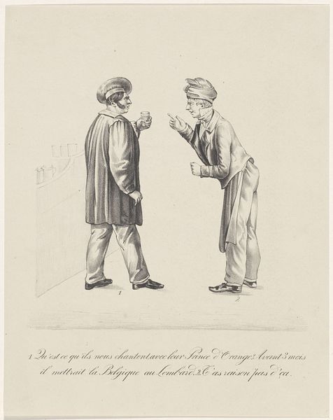 Pieter van Loon made this drawing titled "Drie staande mannen" with pen in gray ink. During the 19th century, the Netherlands was undergoing significant social and economic changes. This drawing depicts three men engaged in what seems to be a lively conversation. The figures appear to be working-class individuals. Their clothing, while simple, speaks volumes about their position in society. The interaction between these men, captured with such candidness, offers a glimpse into their daily lives and social dynamics. It’s interesting to note the inscription above the figures, which adds another layer to the drawing. The text translates to "Hey do you have any plum tobacco" suggesting a moment of camaraderie or perhaps a mundane exchange, reflecting the everyday concerns and simple pleasures of working-class life. Van Loon's drawing serves as a poignant reminder of the importance of documenting the lives and stories of those who are often overlooked in history. It invites us to consider the complexities of social class and the bonds that unite individuals across different backgrounds.