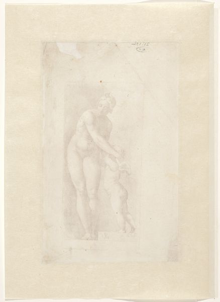 This drawing was convincingly attributed to Anton Eisenhoit by Monroe Warshaw recently. It has stumped connoisseurs for fifty years, bouncing from Haarlem to Rome, Prague to Fontainebleau. Given to the museum as a work of the circle of Bartholomäus Spranger, the sheet was subsequently attributed over the decades to Lelio Orsi (Konrad Oberhuber), Marten van Heemskerk, Vincent Sellaer (George Keyes), and Lucas de Heere. Despite the diversity of these artists, a common thread is apparent, the hand must belong to a mid to late 16th-century artist who worked in Rome, or, in the very least, was profoundly influenced by the art of Rome at that time. The German artist Anton Eisenhoit neatly fits this profile. He traveled to Rome around 1580, working there for a few years primarily as an engraver before returning to his native Westphalia, where his career as a goldsmith and medalist flourished. The linear style of the drawing and meticulous crosshatching are consistent with Eisenhoit's pen work. Likewise the particular figure type and pose can be traced in a number of the artist's prints--the monumental, graceful female figure type, with massive fingers and long, widely spaced toes, shown rhetorically gesturing as she demurely turns her head away, revealing an elegant down-turned profile.