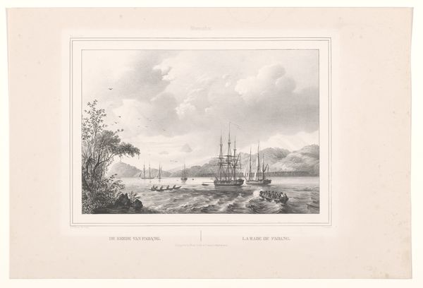 Curator: This is Paulus Lauters’ “Gezicht op havenstad Ampenan,” or "View of the Port City of Ampenan," dating from 1843-1845. It's currently held here at the Rijksmuseum and made with engraving. Editor: Immediately, the stillness strikes me. The muted grayscale palette contributes to a tranquil, almost melancholic mood. Curator: Lauters was meticulous. You can almost feel the texture of the paper, and it gives such impressive details regarding the ships' construction as well as the local boats. I see Dutch flags, implying colonial activity, with the ships functioning as economic vehicles and military assertions of Dutch power. Editor: The boats do seem dwarfed, visually minimized in relation to that large ship and also to the implied mountain. I am more curious about the smaller indigenous boats depicted closer to the shore – symbols of the everyday lives, and also modes of sustenance and travel. What stories do they hold? Curator: I find it interesting that Lauters focuses on the activity, but he remains so distant and somewhat romanticizes it. This perspective likely influenced public opinion on overseas expansion. This artistic choice suggests how value was then culturally placed in Europe as central, and places in the margins. Editor: Yes, the composition frames Ampenan almost like a distant promise, ripe for… well, resource extraction and colonial influence. The light and shadows certainly amplify that kind of perspective. And beyond mere landscape, the symbolic meaning lies in how people navigate this place – a commentary of ambition and exploitation as tools for power. Curator: Thinking about production, prints like these had a huge reach. They influenced public imagination and policy relating to trade and colonial governance in the nineteenth century. The dissemination and interpretation is a key point, no? Editor: Precisely. By recognizing how these images circulate, we reveal a dialogue between representation, authority, and how people negotiate symbolic terrain. And perhaps recognize what’s lost in the translation. Curator: Seeing the port city rendered so methodically, you become acutely aware of both technical prowess of Lauters’ practice and broader narrative it served. Editor: Ultimately, the romantic stillness invites consideration, prompting you to investigate a network of material interactions and layered meanings imbued into a seemingly simple view.