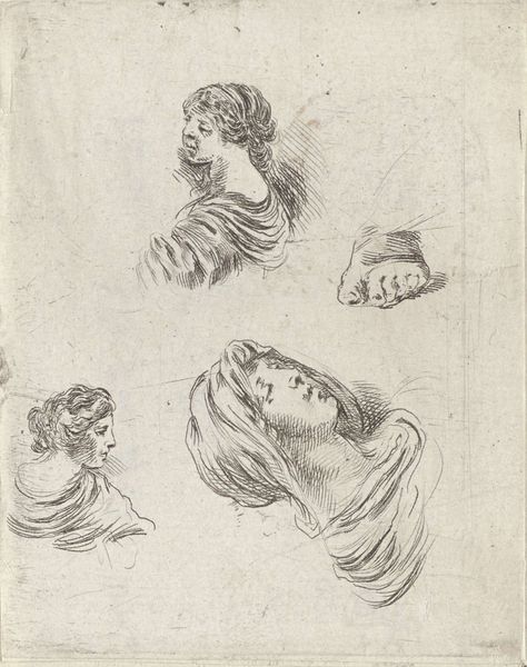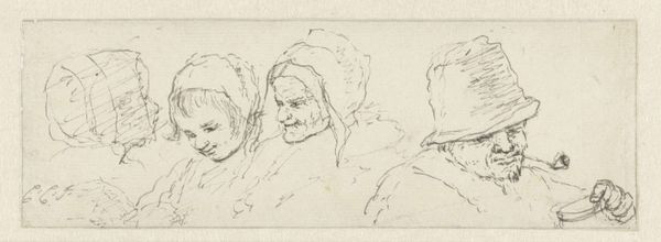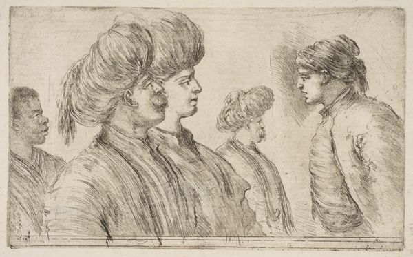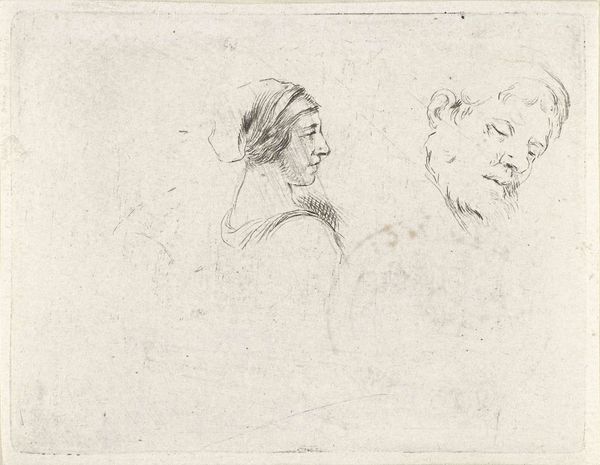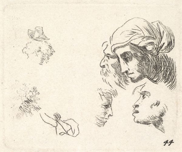 Stefano della Bella made this print, *Hoofden van een vrouw, een oude man met baard en van een soldaat met helm,* using etching, a printmaking technique dependent on acid. To make this image, a metal plate, likely copper or zinc, would have been coated with a waxy, acid-resistant substance. The artist then scratched through this ground with a sharp needle, exposing the metal. When the plate was submerged in acid, the exposed lines would be bitten, creating grooves. These grooves hold ink, which is then transferred to paper under pressure. Della Bella’s rapid, confident lines, especially the hatching and cross-hatching to indicate shadow, speak to his mastery of the etching process. The efficiency of printmaking allowed for the wide distribution of images, and Stefano della Bella, like many artists, used prints to broaden his reach, both artistically and commercially. This democratization of image-making challenges any strict separation of art from craft and commerce.