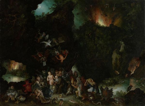 Jan Brueghel the Elder painted this "Temptation of St Anthony" with oil on panel. The painting immerses us in a world of darkness pierced by flickering light. Brueghel uses light to define form and space, highlighting the figures of St. Anthony and his tormentors. Notice how the composition draws the eye from the periphery into the central gathering, a locus of moral and spiritual conflict. The contrast between the cool moonlight and the hellish fire symbolizes the dichotomy of salvation and damnation. The artist's precise brushstrokes render the textures of skin, fabric, and monstrous forms with equal attention. This challenges fixed meanings and representation by blending religious narrative with genre painting. The formal structure of the painting, with its play of light and shadow, ultimately underscores the tension between earthly temptation and divine virtue. Art doesn't have a singular meaning, but is a site of ongoing interpretation.