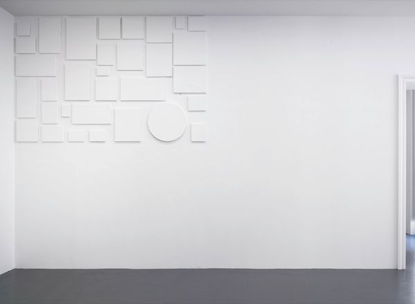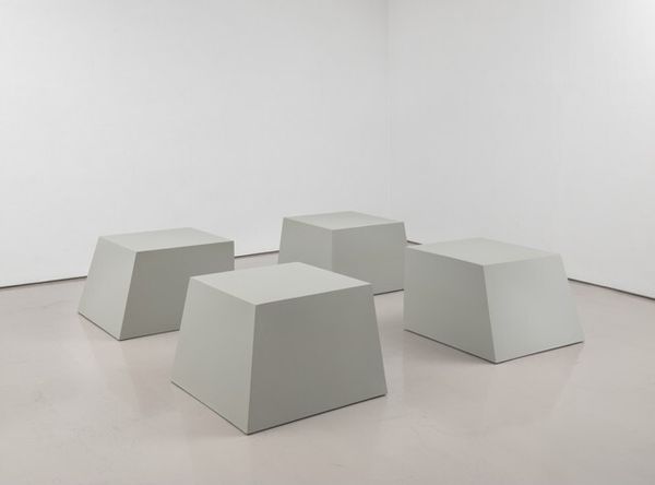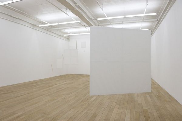 Curator: Here we have Claude Rutault’s "dé-finition/méthode #4: peint / repeint (‘la france défigurée’ 1969) / non peint," created in 1973. What strikes you about this piece? Editor: Well, initially it reads as incredibly simple – three square canvases, two white, one a drab brown. But the placement, the leaning canvas… it hints at something more than just minimalist aesthetics. There's a suggestion of labor, a pause in activity perhaps. Curator: Rutault’s work challenges traditional painting conventions. His "définitions/méthodes" are sets of instructions, a conceptual framework. In this piece, it seems, the artist uses the gallery space itself to complete the work. Editor: Instructions... so this arrangement, this particular installation is just one possibility then? I like the idea of the gallery walls as material too, a supporting element, and how the piece makes you very aware of the gallery as a site. Curator: Precisely! It speaks volumes about the institutional framing of art. "La France Défigurée", or "France Disfigured," suggests a societal critique from 1969, perhaps alluding to the sociopolitical upheavals of that period. And then in '73 it is ‘repainted’. What changed between then and now? Editor: That’s where the material element pulls me in. What kind of paint, what are the canvases made of? The act of painting and repainting… it becomes about the physical process and almost performance of it, labor made visible. Is this piece about exhausting and reclaiming materiality and what it means? Curator: Or about highlighting absence? Notice how the third canvas isn’t painted. Perhaps this calls into question the very idea of what constitutes a finished work of art? It leaves us in a space of questioning... Editor: Yes, I like that thought; instead of seeing absence as nothing, but considering what it enables – almost highlighting our contribution of what we bring to the piece by questioning. It definitely destabilizes the preciousness we often ascribe to art objects. I'm now seeing something past the color and technique, thanks. Curator: And on my side, thanks to your questions regarding labor, I am compelled to ask how different social circumstances affected the process, in turn reflecting what the institution wanted of Rutault’s production in this time period. Food for thought for our listeners.
