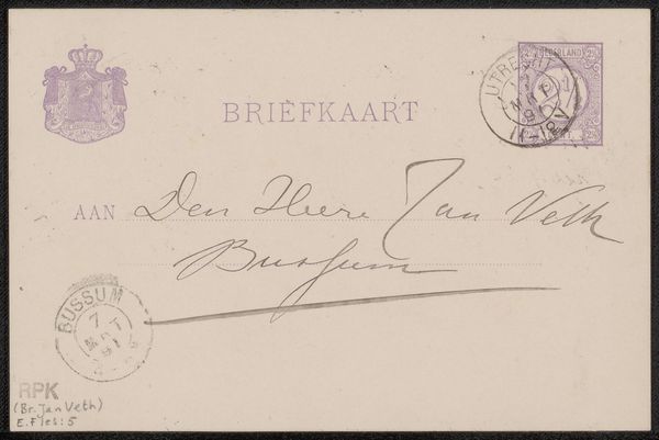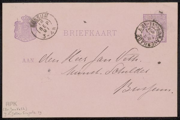 Here we see a postcard to Jan Veth by Wally Moes, likely dating from around 1911, created with ink on paper. The faint lilac of the paper, stamped emblems, and the dark purple ink create a delicate yet formal composition. The careful arrangement of the textual elements across the rectangular surface speaks volumes about the semiotics of correspondence. The stamps, with their circular forms, anchor the upper corners, framing the central written message. The handwritten script, elegant and flowing, contrasts with the block-printed word "BRIEFKAART," creating a visual dialogue between personal expression and standardized communication. Even the placement of the postmark is integral. It acts as a signifier of time and place, subtly challenging fixed meanings by layering bureaucratic function with personal sentiment. The contrast between the structured elements and the intimate script invites us to reconsider the boundaries between public and private, official and personal.
