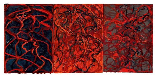 Editor: So, this is Brice Marden's "The Propitious Garden of Plane Image (Version One)" from 2005, created with acrylic paint. It immediately strikes me as… playful, almost like looking at a complex maze of colourful noodles. How do you interpret this work? Curator: Playful is a good start, I reckon! But for me, it's less about the noodles themselves and more about the *spaces* between them. Marden was deeply influenced by calligraphy, particularly Chinese calligraphy, and you can see how those flowing lines are creating their own kind of language, their own energy. It’s like each colour block is a different mood, almost. See how the energy shifts from the warm oranges to the cool blues? It’s almost meditative. Does that resonate with you at all, or am I off in dreamland again? Editor: I can see that, definitely. The transition is subtle but palpable. I was focusing so much on the lines, I almost missed the background. It makes the work feel less chaotic and more… deliberate. Curator: Exactly! And that's the 'propitious' part, maybe. These colour fields, the relationship they have with those interwoven lines. You can almost think of each panel representing elements from a garden, maybe from earth to fire to wind… Maybe that sounds nuts. Editor: No, that makes a lot of sense actually. It definitely changes my perspective on it. Curator: Art is all about changing perspectives, eh? It's a two-way street, after all, or maybe even more than that. It is as the eye gazes into the artwork's surface that we create meaning! Editor: I'll remember that. Thanks! Curator: My pleasure. Until the next masterpiece!