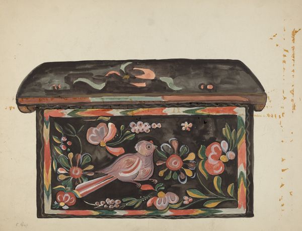 Curator: This is "Sp. Col. Chest," a watercolor by E. Boyd, created around 1936. What catches your eye first? Editor: Immediately, it’s the black background – so striking! It really makes those pastel shades of pink, green, and gold pop. There is something unsettling about such ornate work in this folk-art style. Curator: Yes, it is intentionally stylized! Knowing Boyd’s interest in folk art traditions of the Southwest, this work likely reinterprets the imagery and designs found on traditional Hispanic storage chests, considering the preservation, and presentation of this heritage. Think about what it meant to appropriate traditional forms in the 30’s. Editor: You know, looking at it now through that lens, the black background and the pale dogs flanking that overflowing central vase could be read as more than simply decorative. There is something distinctly unsettling about it that subverts any simple message of tradition, perhaps reflecting the complex social realities of its time. The dark background also highlights how there isn’t depth and brings forward certain iconographic qualities of mural painting traditions. Curator: Exactly, it speaks to a more significant question around who has the authority to represent cultural heritage and to what ends. Consider that the composition mimics heraldry – the placement of the dogs creates a visual suggestion of power or guarding. The presentation may offer insight into the cultural tensions during the New Deal era. Editor: And what is striking about the mural painting context you raised is the implicit accessibility, both for the original communities this folk art comes from, and a newer public. In this artwork the medium itself is the message and shows where art is displayed or consumed shapes the message itself. Curator: I find your thoughts so insightful! This piece continues to push me to rethink preconceived notions about cultural preservation and reinterpretation. Editor: Indeed! It’s in exploring the complex relationships between artistic traditions and societal power dynamics that art becomes a powerful catalyst for critical discourse.