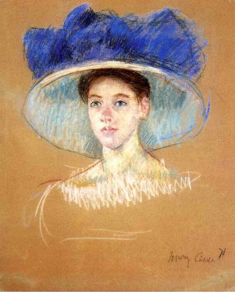 Curator: Stepping closer, we come to Berthe Morisot's pastel from 1893, "Jeanne Pontillon Wearing a Hat." The artwork resides in a Private Collection. Editor: My initial reaction is dreamlike, almost a whisper. It's not about harsh lines or definitive statements but evokes a sense of fleeting beauty. That hat, though – it feels both extravagant and intimately personal. Curator: Indeed. Morisot truly captures a transient moment. Considering it is pastel on paper, there’s an incredible textural range. Look at the layering; each stroke builds volume and emotion. One might consider how radical the casual portrayal was for her time. The artwork pushes back against constraints placed upon women and their representation. Editor: Absolutely. You see this piece and immediately wonder about the actual manufacture of the pastels. Who ground the pigments, what was the binder? Was Morisot mixing her own, carefully controlling the quality, or reliant on commercially produced sticks? Curator: It's quite interesting you bring that up. Thinking about materiality gives context to her practice. Perhaps she relished in making the raw materials to embrace domestic practices into the professional creative process. There is an alchemic and empowering feel to the action, you know? Editor: Precisely. It allows us to connect to both Morisot's labor, and that of the countless anonymous craftspeople involved in producing the tools of her trade. Thinking about these things adds another layer to our understanding, questioning where value lies in art production. Curator: It also adds a level of grounding—knowing the physical efforts can emphasize the intimacy of this artwork, capturing not only the visual likeness but something akin to the soul. The more one studies this artwork, the more personal it feels. It's akin to understanding the intimate connection between creator and creation, right? Editor: In a way, yes. The connection between creator and materials can shape meaning. In closing, what is your biggest takeaway? Curator: Mine? The profound tenderness with which Morisot seems to have regarded her subject. A testament to the enduring power of fleeting beauty. Editor: And for me, the recognition that even within the apparent spontaneity, there lies a carefully orchestrated relationship to material conditions and the social landscape.