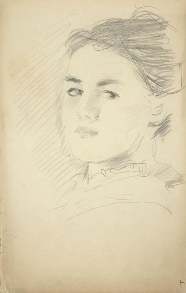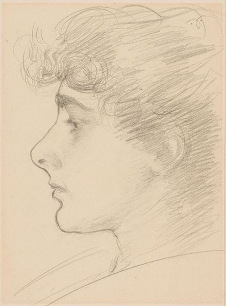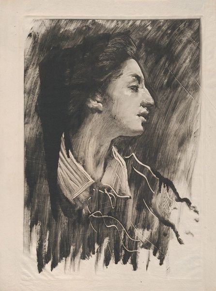 Editor: This is Paul César Helleu's "Femme de profil," an etching that I find very elegant, particularly due to its refined lines. What do you see in this piece, particularly when considering its historical context? Curator: Thank you. Considering Helleu's artistic milieu, this "Femme de profil" isn't just a portrait; it's a statement on the prevailing beauty standards and social roles ascribed to women in the late 19th and early 20th centuries. Her idealized beauty, captured through delicate lines and a somewhat passive gaze, speaks volumes about the objectification prevalent during that time. How does the emphasis on her appearance contribute to our understanding of women's roles then? Editor: I see what you mean. The lines really do guide your eyes, focusing on her face and hairstyle, almost making her an ornament. So, how does Helleu's work relate to broader feminist dialogues within art history? Curator: Helleu's work is fascinating in this regard, as it stands at a critical juncture. On one hand, he perpetuated a certain aesthetic of idealized femininity, reflecting patriarchal norms. But his technique – that incredibly sensitive rendering – also subtly acknowledges the presence and perhaps even the inner life of the sitter. Think about how this contrasts with, say, contemporary depictions by female artists who were actively challenging these constraints. Editor: That is a perspective I had not considered. Thinking about the broader narrative of women in art makes me realize this is more than just a beautiful portrait. Curator: Exactly. Art gives a critical insight into the position of women throughout history.