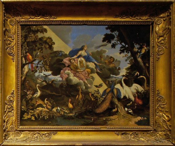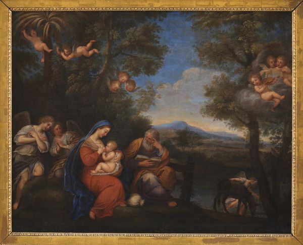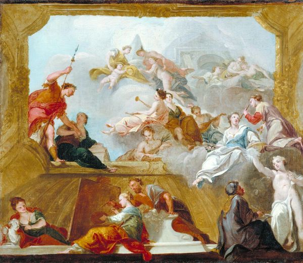 Editor: Here we have Charles Le Brun’s "Adorazione dei pastori," from 1688, rendered in oil paint. It's such a vibrant, bustling scene, full of figures. What strikes me is how the heavenly and the earthly seem to converge. How do you interpret this work, especially within its historical context? Curator: Considering the era and Le Brun's position, this work speaks volumes about power dynamics and religious ideology. The Baroque period emphasized grandeur and emotional impact, which are certainly on display. But let's think about what this scene is actually portraying. It’s an idealized, perhaps even sanitized, version of the Nativity, intended for a specific aristocratic audience. Who is conspicuously absent or marginalized in this representation? Editor: I see what you mean. The shepherds, though present, seem almost like extras in a grand play, and it definitely feels like Mary is idealized. It's less about their lived experiences and more about the symbolic weight of the event, viewed through a privileged lens. Curator: Precisely! Le Brun, as a court painter, was essentially crafting propaganda, reinforcing the established order. Consider the function of light in the image – divine light illuminates the Holy Family, reinforcing their central importance. But whose light are we not seeing? Whose stories remain in the shadows? Editor: So it's not just about the biblical narrative, but also about the narrative *being told* through the painting? The elite gaze shapes the representation, overshadowing other perspectives. Curator: Exactly! Art never exists in a vacuum. Examining whose voices are amplified, and whose are silenced, unveils so much about the values and power structures of the time. It prompts critical reflection. Editor: This makes me rethink how I approach historical art. It's not just about aesthetic appreciation; it’s also about critically analyzing the socio-political narratives embedded within. Thank you. Curator: My pleasure. This perspective enhances our appreciation and helps reveal complexities and historical truths about both the art and our interpretations.