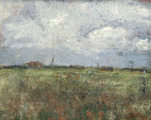 Curator: What immediately strikes me is the gentle, almost melancholic light bathing this scene. Editor: Indeed. Let's take a closer look at "Dunkerque. Une pêcheuse de crevettes". The artist is Camille Corot. While the date of the artwork is unknown, it presents an intriguing glimpse into the visual culture and life around Dunkerque, probably 19th century. Curator: That single figure carrying a net...she represents a profound link between the community, the land, and their livelihood. Editor: The fishing net definitely symbolizes labor, tradition, and resilience. Consider how the seemingly mundane task of shrimping connects to larger ideas of community, survival, and humanity’s relationship with nature. Curator: And it's interesting that Corot doesn’t idealize her. There's a realism, almost a casualness, in her stance that resists romantic notions of peasant life. Editor: You know, the unassuming details—the unassuming palette dominated by grays and muted blues and greens—speak to a more profound connection to a way of life that's inherently tied to the sea and to manual labor. Also, let’s consider how art academies and the market began incorporating genre painting into mainstream exhibitions, so Corot participates to some extent in the aesthetic valorization of rural life. Curator: Perhaps. For me, the emotional power here lies not in overt symbolism but in the atmospheric rendering of a specific place and its connection to collective identity. The light itself feels laden with unspoken narratives. Editor: Absolutely, and by capturing the quiet dignity of this pêcheuse de crevettes, Corot elevates her and invites us to reflect on a slower, more intimately connected way of living, beyond just historical record, tapping into primal archetypes of provider and sustenance. Curator: It is certainly a view that lingers and quietly unsettles. A humble presentation that stimulates reflection on everyday resilience and perseverance. Editor: Precisely. The artwork offers a subtle yet lasting connection to the cultural significance of our daily actions and lives.