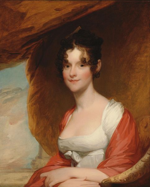 Curator: This is Joseph Wright of Derby's "Portrait of Mrs. Abney," an oil painting currently held in a private collection. Editor: It projects a quiet domesticity. There’s something very calm and reserved about her pose, the almost luminous white of her dress against that somber backdrop. Curator: Right, let's consider the means of production here. Oil paint allowed for incredible detail. You can almost feel the texture of that fabric, imagine the artist's hand meticulously layering those thin glazes. Think of the pigments themselves—where they came from, the labor involved in grinding them, mixing them. This all points to a certain level of privilege afforded to both artist and sitter. Editor: Absolutely. It's also intriguing to consider who Mrs. Abney was. A portrait like this was a statement—a display of status, an entry into a visual history of her family and the wider social world. We can only speculate on how the portrait affected Mrs Abney's standing among her peers, however. Curator: Precisely, and the objects surrounding her–the sewing materials, the birdcage. They weren’t simply decorative. They represented the cultivated pastimes of women of her station, illustrating the very definition of refinement during this time period. Editor: A good point; her act of sewing transforms labor itself into a signifier of virtue and leisure. The light is very intentional. Wright expertly manipulates it, drawing our attention to her face and hands. In many ways, the way he controls light became his artistic brand and an act that put the sitter in the limelight as it were. Curator: Yes, it becomes very apparent that it's so much more than mere representation; it's an examination of craft itself. And that carries its own inherent political and social weight. It also challenges this assumed division of labor between artistry and mere decoration or even a skill, per say. Editor: So true! Overall, this portrait isn't just a likeness; it’s an artifact deeply embedded in the social fabric of its time. Curator: Exactly! It leaves me considering the value we place on the time and skill that creates even seemingly the simplest elements in such a composed world. Editor: And for me, the power dynamics inherent in capturing and preserving a specific image for posterity. Both perspectives enrich our understanding of this rather lovely work.