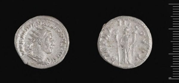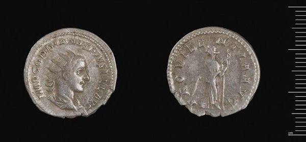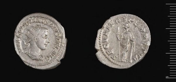 Curator: This is an Antoninianus, a Roman coin from the reign of Gordian III. Editor: It looks so small, yet it carries so much symbolic weight, doesn't it? The portrait alone is a powerful statement. Curator: Absolutely. These coins were a primary means of disseminating the emperor's image and projecting imperial power throughout the Roman world. Editor: The figure on the reverse—is that a deity? What does that imagery tell us about the aspirations of Gordian III? Curator: Likely a representation of a Roman god, perhaps Jupiter or Mars, associating the emperor with divine favor and military strength. Coinage like this shaped public perception of the emperor. Editor: It's fascinating how a tiny object like this could carry such massive cultural and political significance. Curator: Precisely, and understanding that connection between image and power is key to understanding Roman society. Editor: A reminder that even the smallest things can speak volumes.